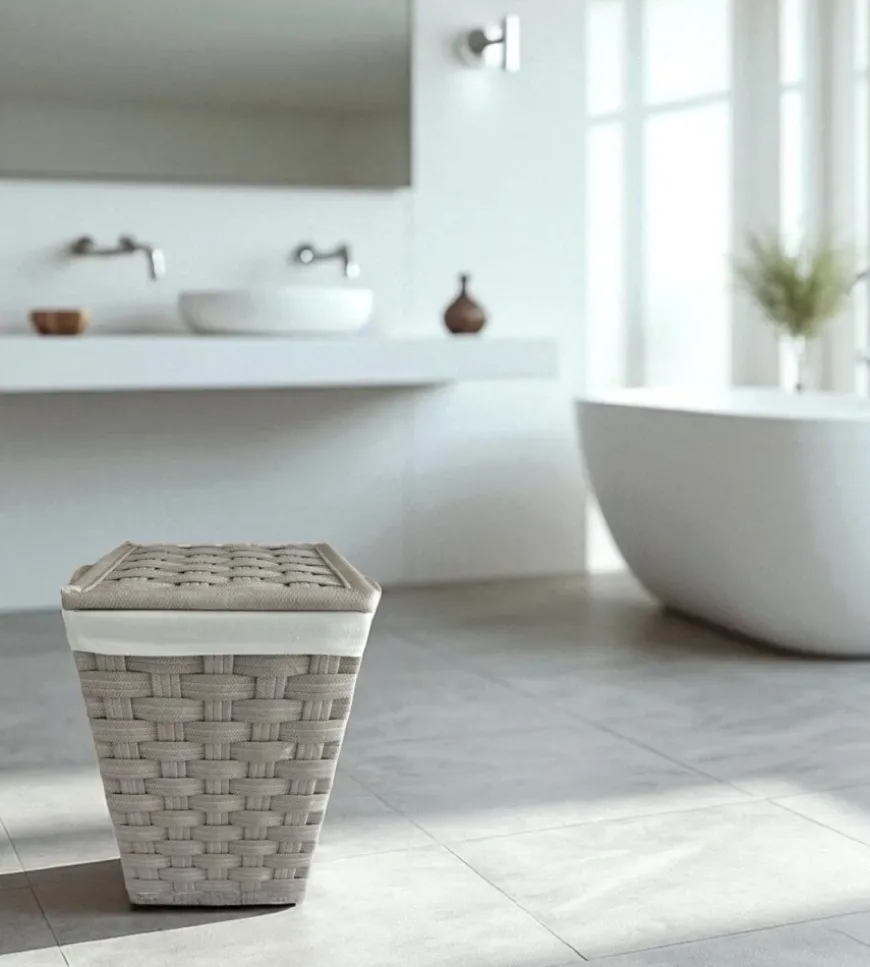 - Portabiancheria piccolo in TNT beige con finitura in finto rattan