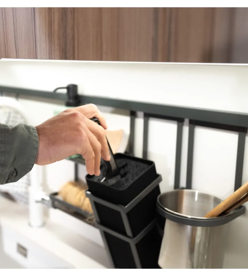 Abbinalo agli altri elementi della serie Titane per creare la barra porta oggetti più adatta per la tua cucina.