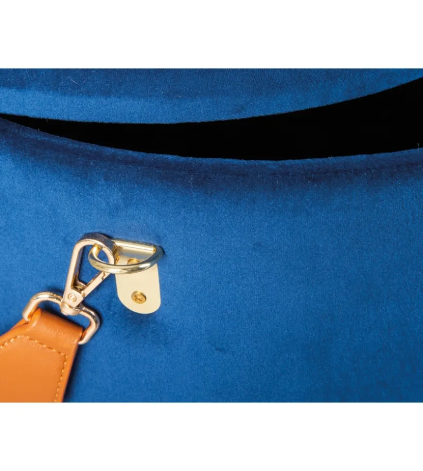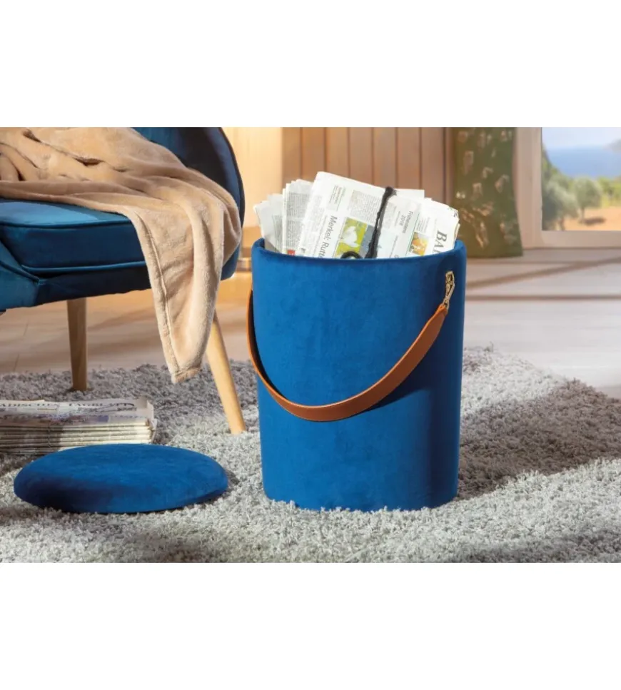 Pouf “secchiello” in velluto blu con maniglia, 35x35x45 cm