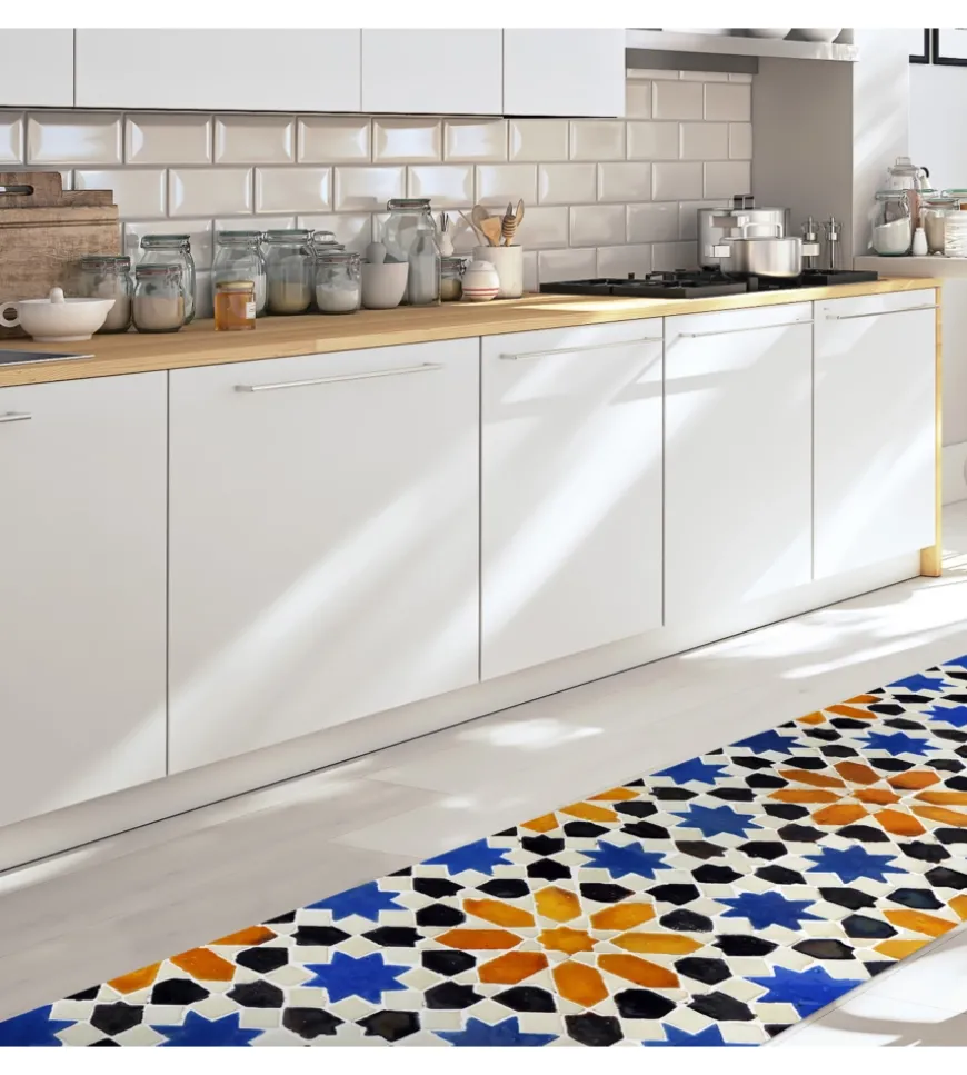 Tappeto spessorato in vinile da 2,5 mm, misura 50×180 cm rifinito in stile piastrelle spagnole, perfetto per essere posizionato ai piedi di una cucina, un’isola, come scendiletto o davanti ad un divano, per un tocco di classe e ad effetto.
