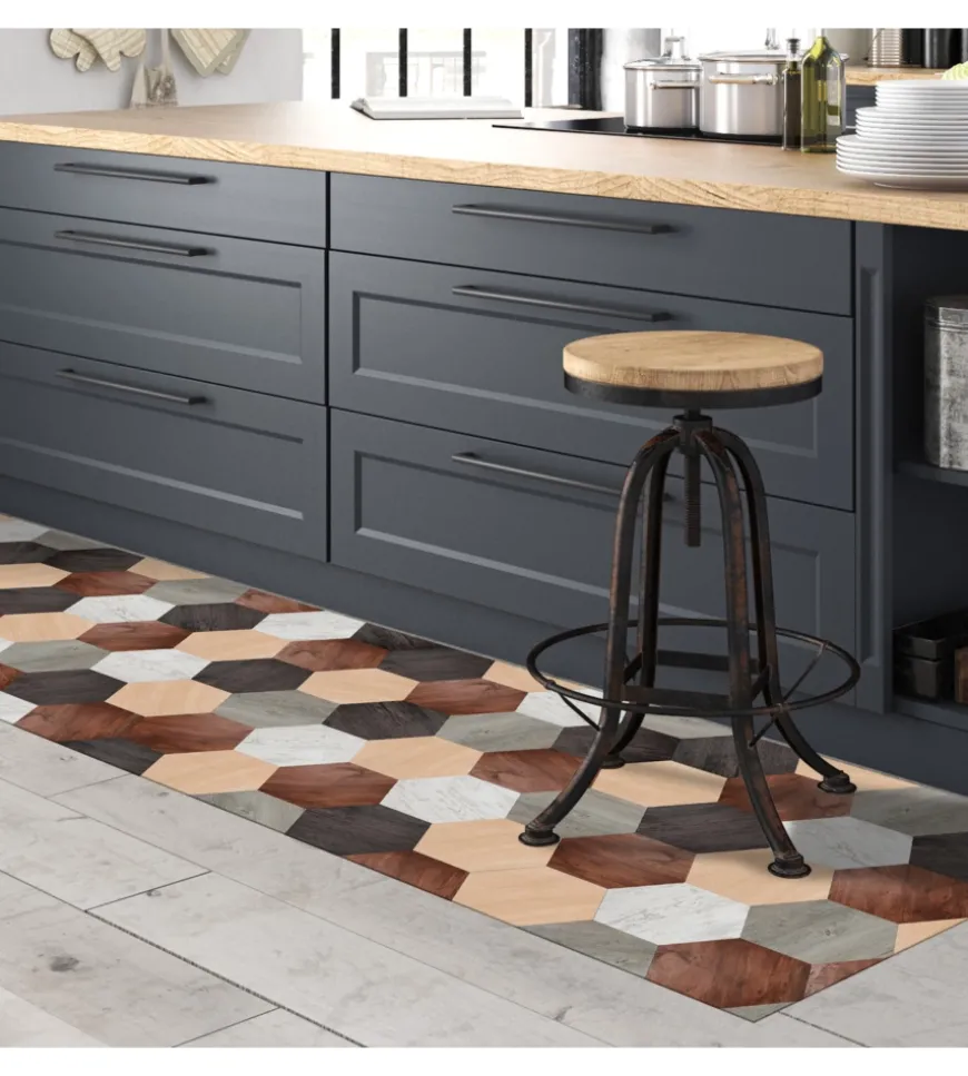 Tappeto spessorato in vinile da 2,5 mm, misura 50×180 cm rifinito con effetto legno, perfetto per essere posizionato ai piedi di una cucina, un’isola, come scendiletto o davanti ad un divano, per un tocco di classe e ad effetto.