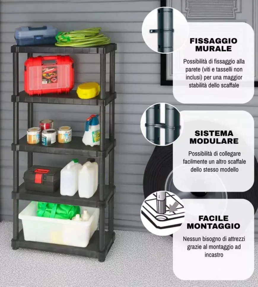 - Portata 44 kg a ripiano (220 kg totali – UNI EN 14749:2016)