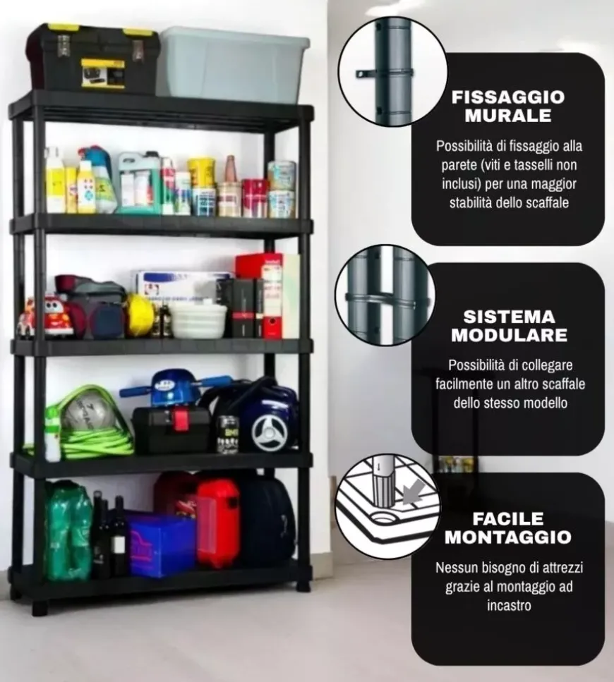 - Portata 70 kg a ripiano (350 kg totali – UNI EN 14749:2016)