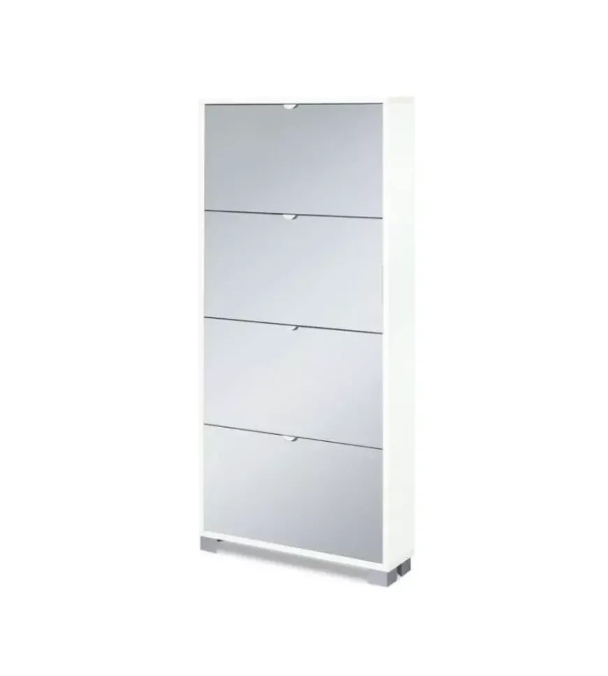 Scarpiera bianca con quattro ante a specchio con apertura a ribalta.