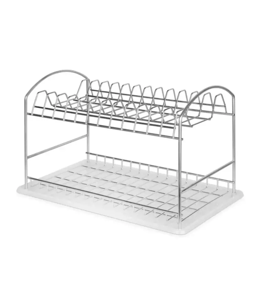 Scolapiatti in acciaio con vassoio in plastica bianca.