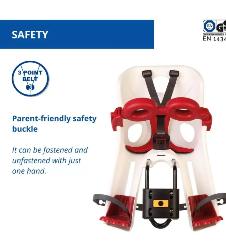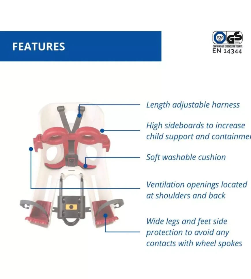 Il seggiolino anteriore è progettato per garantire la sicurezza e il comfort dei bambini da 9 mesi fino ai 3 anni, con un peso massimo di 15 kg. È compatibile con biciclette che hanno ruote di raggio tra 26” e 28” e può essere utilizzato anche su e-bike. Tuttavia, non è adatto per biciclette equipaggiate con freni a bacchetta.