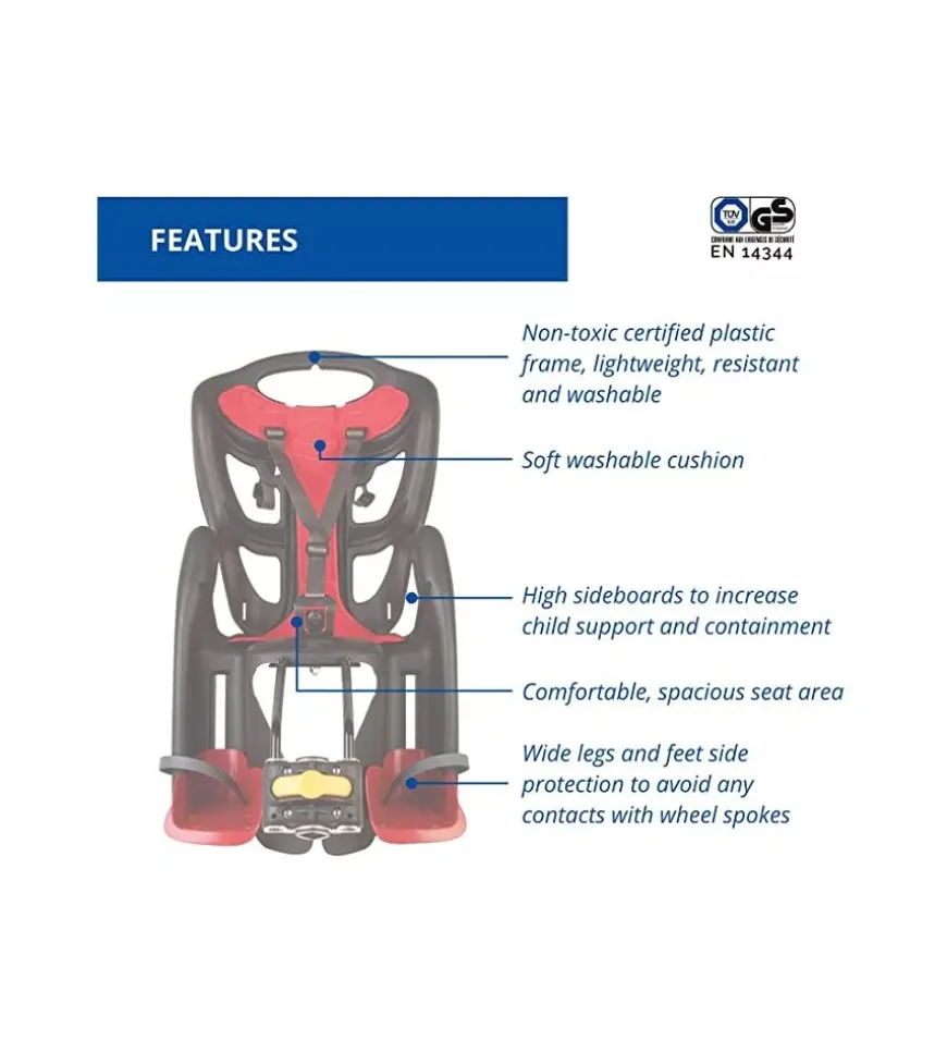 Seggiolino posteriore nero e rosso per bicicletta per bambini, max. 22 kg, da 3 a 8 anni – si fissa al telaio