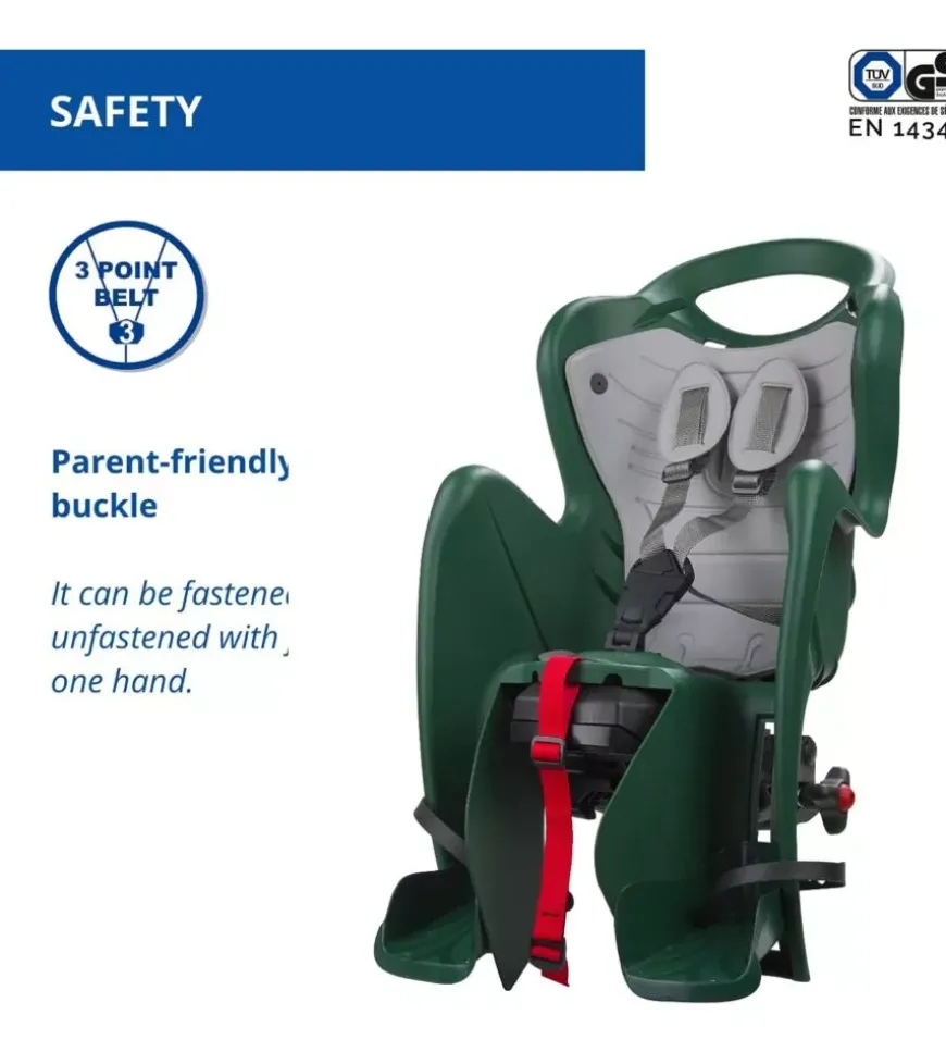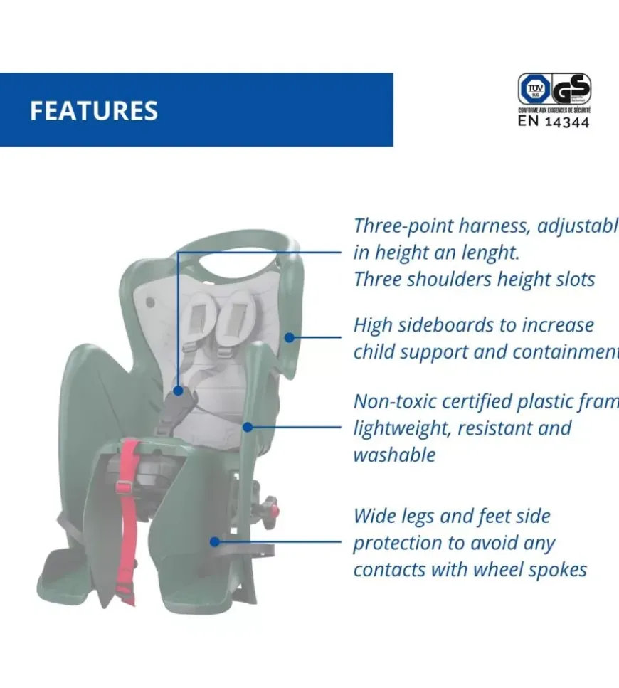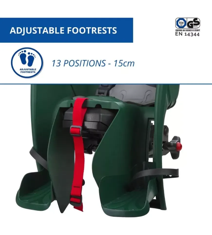 La struttura del seggiolino è realizzata in plastica atossica, un materiale leggero e resistente che assicura facilità di pulizia e lunga durata nel tempo. Un ulteriore vantaggio è la possibilità di regolare l’altezza dei poggiapiedi in 13 posizioni diverse, per un totale di 15 cm di regolazione. Questo permette di adattare il seggiolino alla crescita del bambino, mantenendo sempre una posizione comoda e sicura. Infine, il design del seggiolino è studiato per offrire il massimo comfort. Lo schienale ha un’angolazione ergonomica che sostiene adeguatamente il collo del bambino, e c’è anche un alloggiamento apposito per il caschetto. Questo assicura un viaggio confortevole e sicuro sia per il bambino che per chi guida la bicicletta.