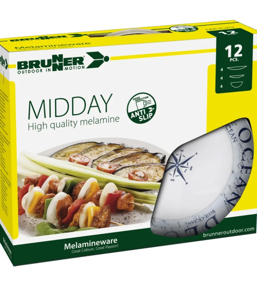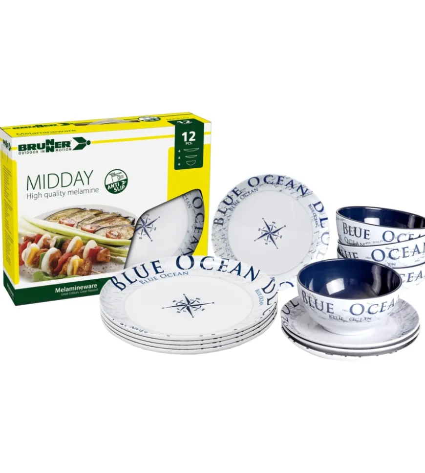 Set di stoviglie in melamina di alta qualità (12 pezzi). Tutti i pezzi sono dotati di sistema antiscivolo.