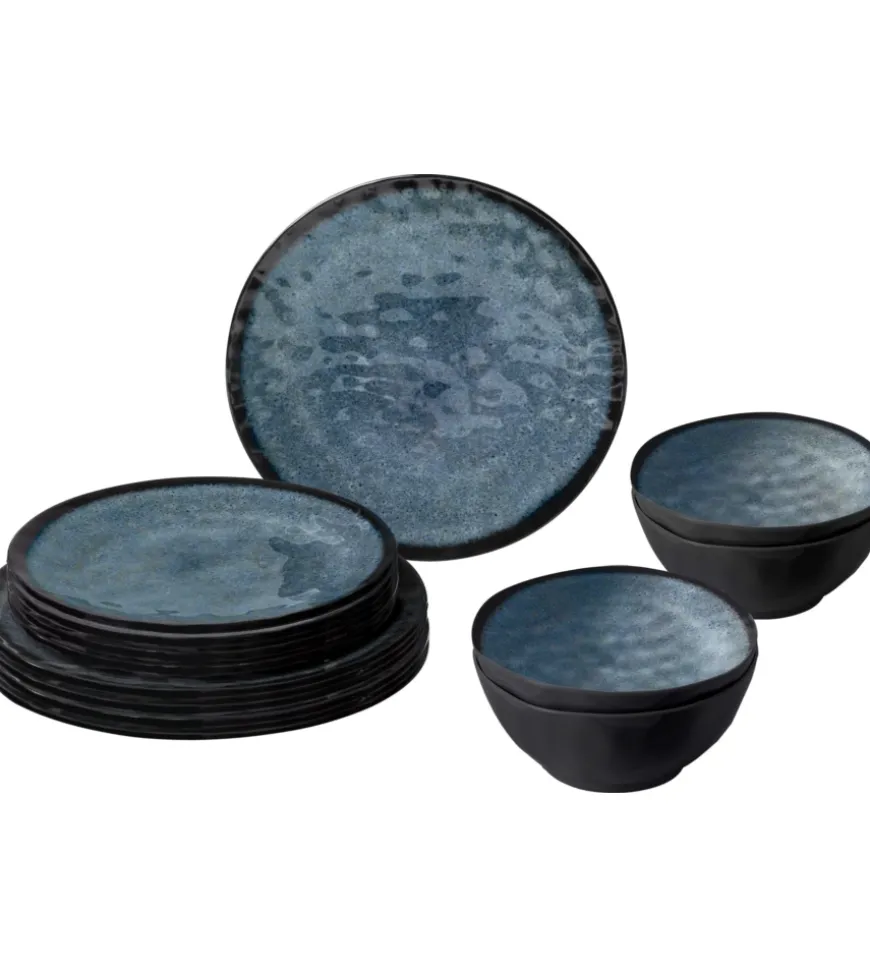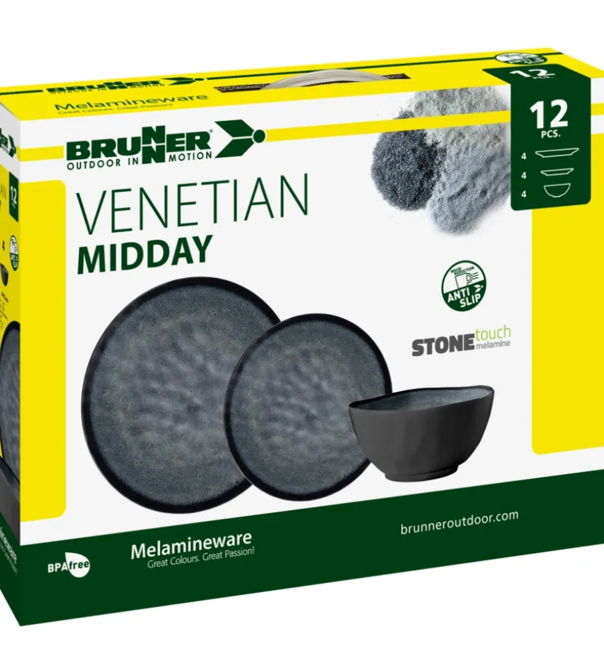 Set di stoviglie in melamina di alta qualità (12 pezzi). Tutti i pezzi sono dotati di sistema antislip.