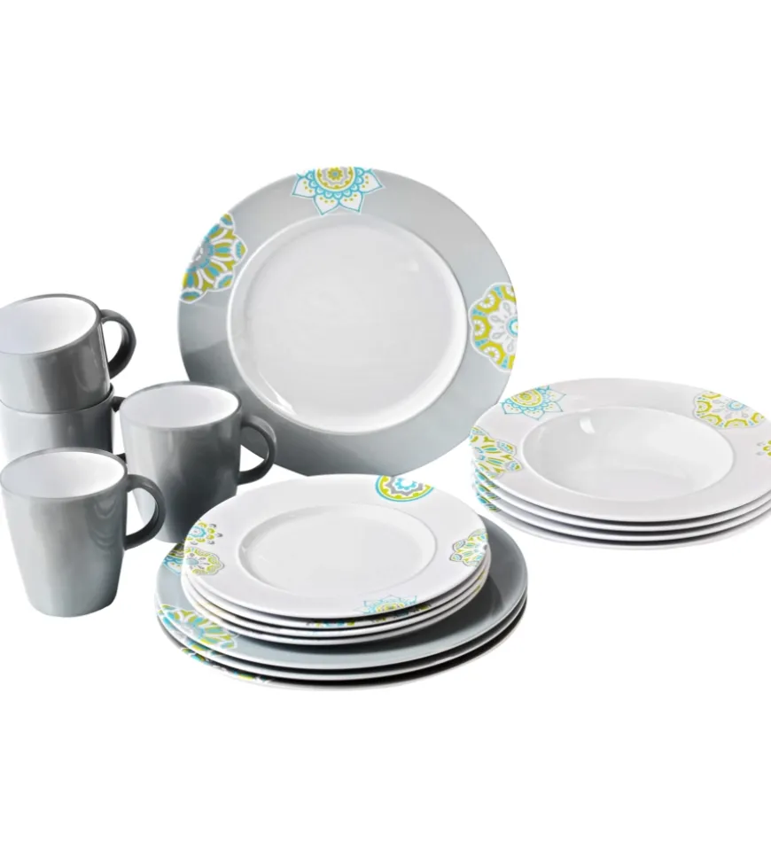 Set di stoviglie in melamina di alta qualità (16 pezzi). Tutti i pezzi sono dotati di sistema antislip.