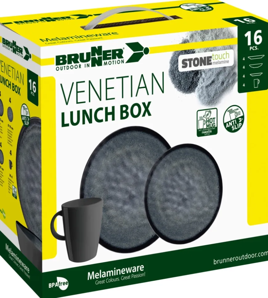 Set di stoviglie in melamina di alta qualità (16 pezzi). Tutti i pezzi sono dotati di sistema antiscivolo.