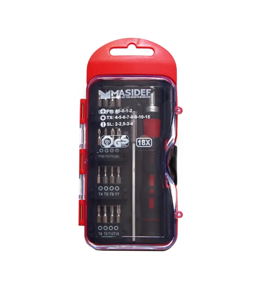 - 16 inserti: slot 2 – 2,5 – 3 – 4 mm. PH 00 – 0 – 1 – 2. TX 4 – 5 – 6 – 7 – 8 – 9 – 10 – 15