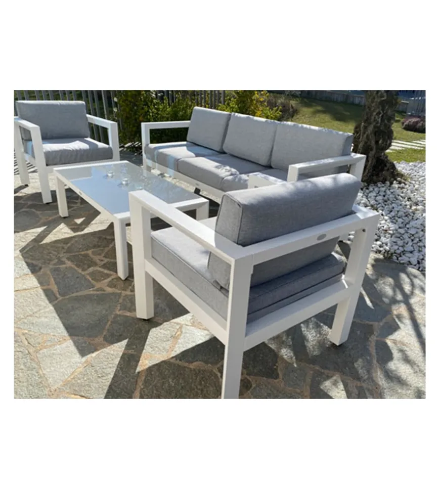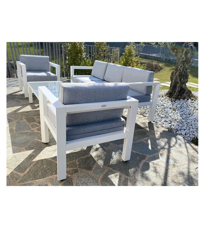 - Set composto da un divano tre posti, due poltrone, un tavolino co top in vetro temperato