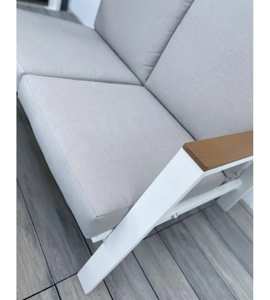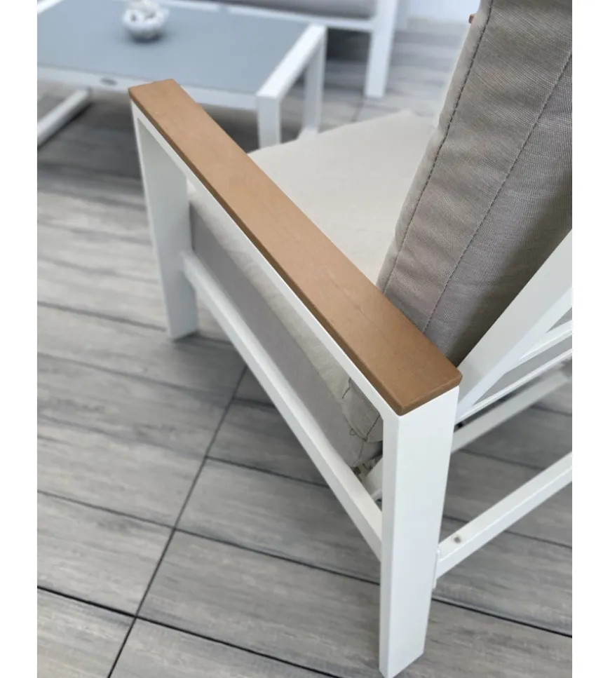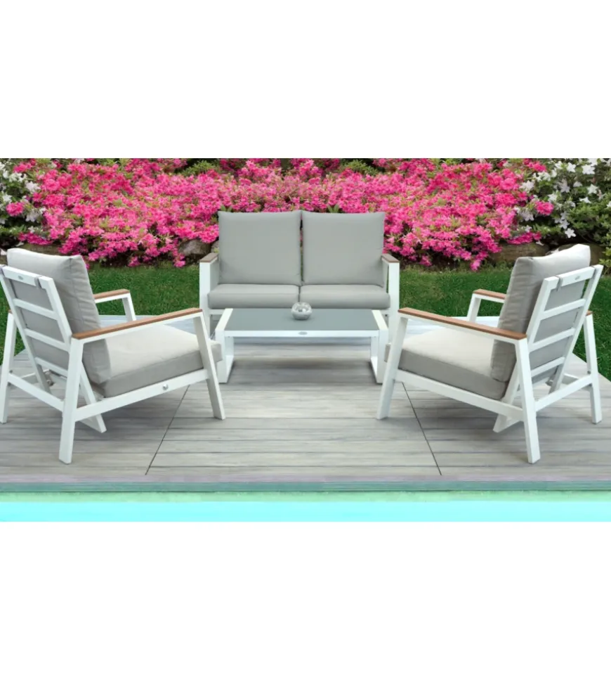 - Set composto da un divano a due posti, due poltrone e un tavolino con top in vetro temperato