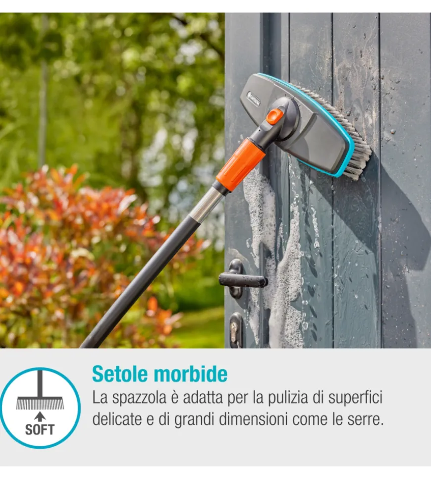 - Incluso: 1 set di pulizia Cleansystem Gardena con manico ad acqua soft, 1 idrospazzola soft, 1 manico ad acqua