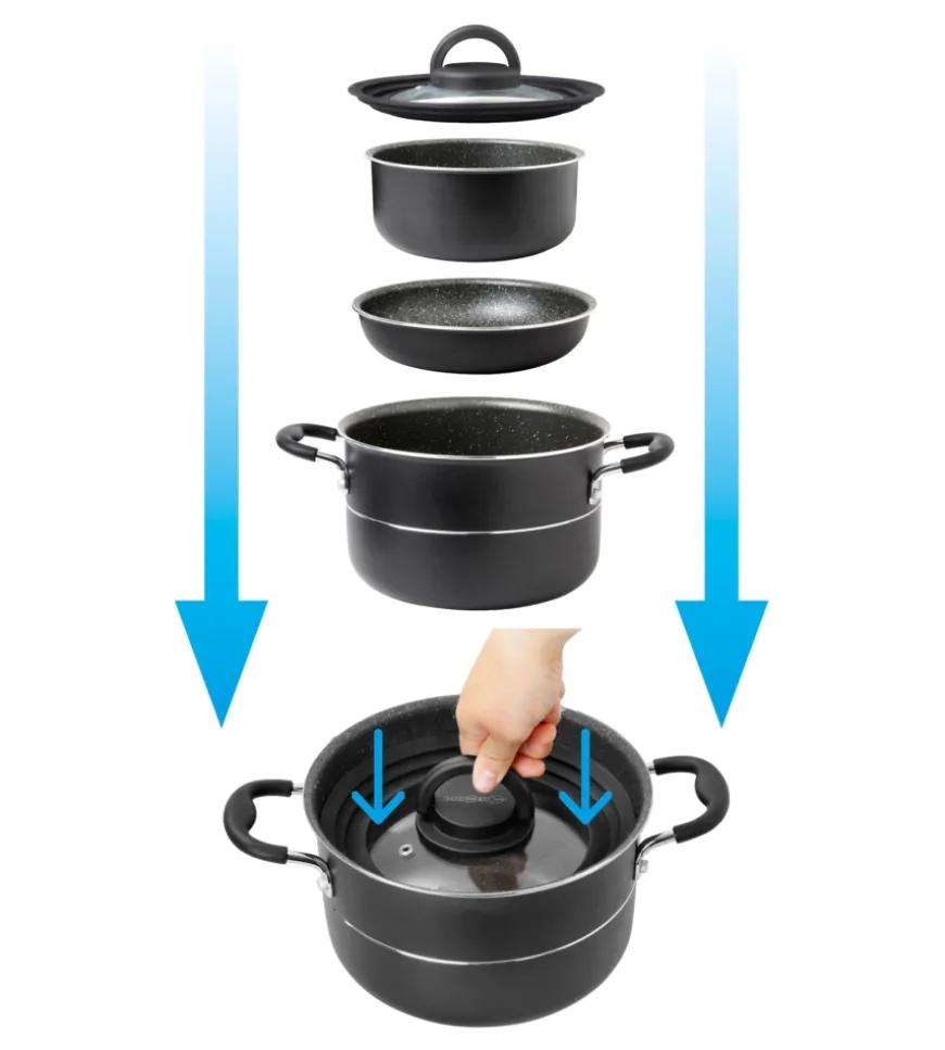 Set pentole in alluminio (7+1) con rivestimento Stone Rock e adatta per fornelli a induzione. Fornite con copechio Vacublock e coperchio scolapasta