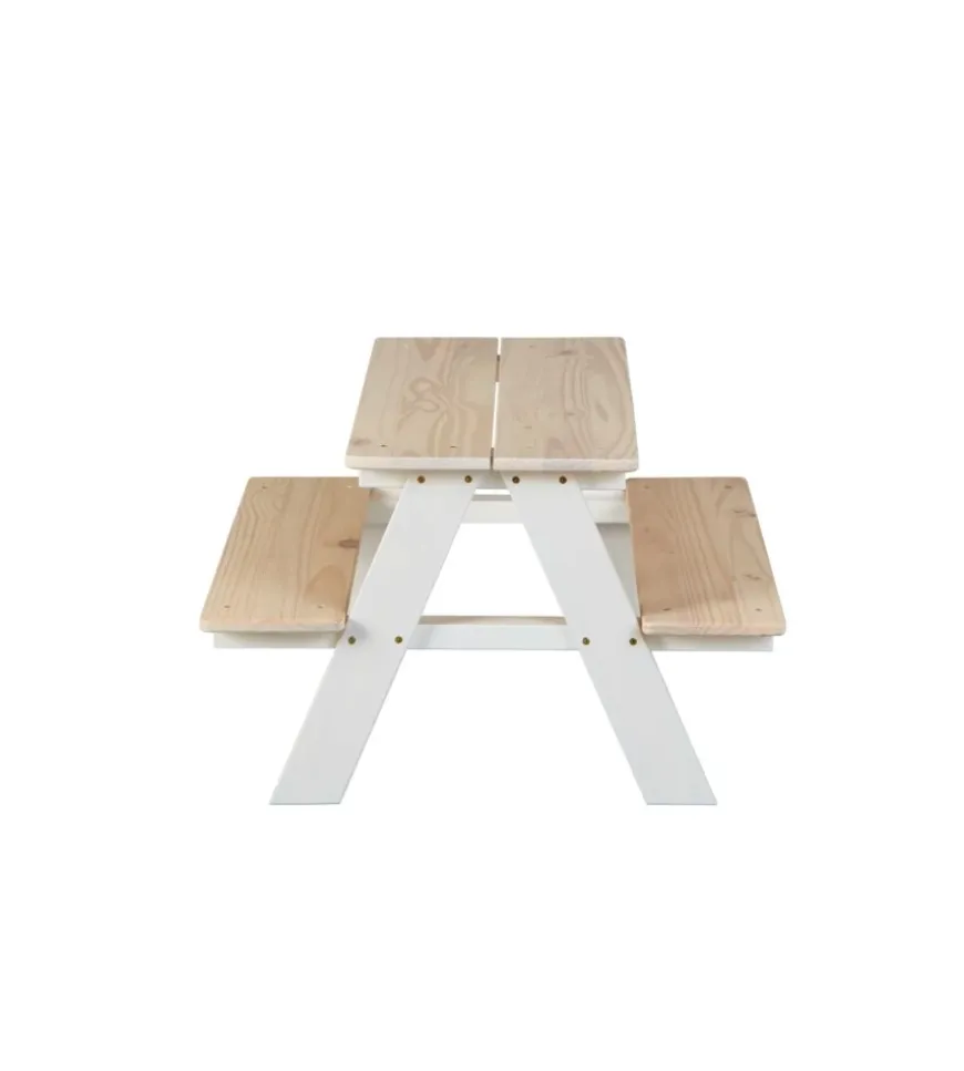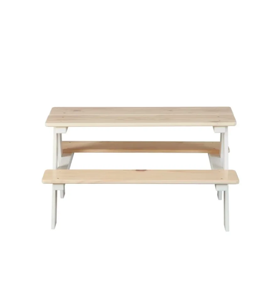 Set tavolo con panche in legno di pino massello per bambini, con struttura tinta bianca e top naturale.