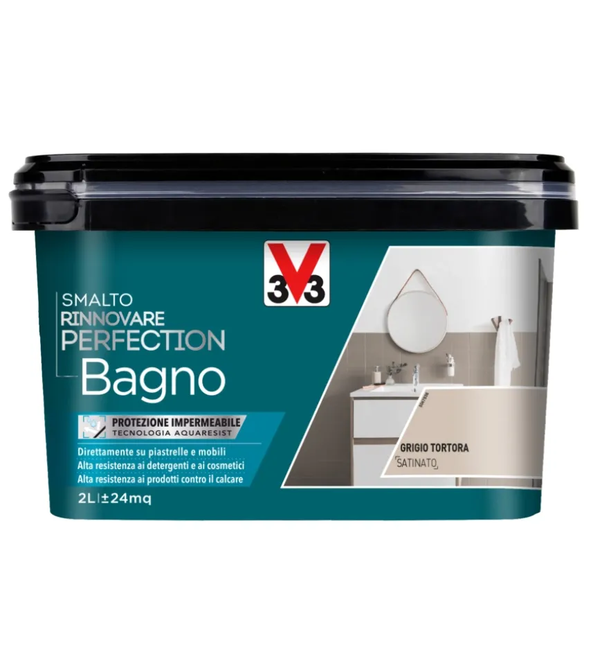 Smalto multi-materiale rinnovare perfection – bagno – grigio tortora satinato – 2 litri. Smalto tecnico all’acqua ideale per rinnovare qualsiasi superficie del bagno, senza fatica e alla portata di tutti.Rinnovare Perfection Bagno si avvale dell’esclusiva tecnologia Acquaresist® – Protezione Impermeabile:1) Estrema resistenza ai getti continui d’acqua2) Alta resistenza agli sbalzi di temperatura dell’acqua (10°C/40°C)3) Super resistenza ai detergenti per la cura della casaCARATTERISTICHE:- Formulazione all’acqua- Aspetto satinato- Resa 12 mq/l- Essiccazione tra due mani: 12 ore- Essiccazione totale: 24 ore