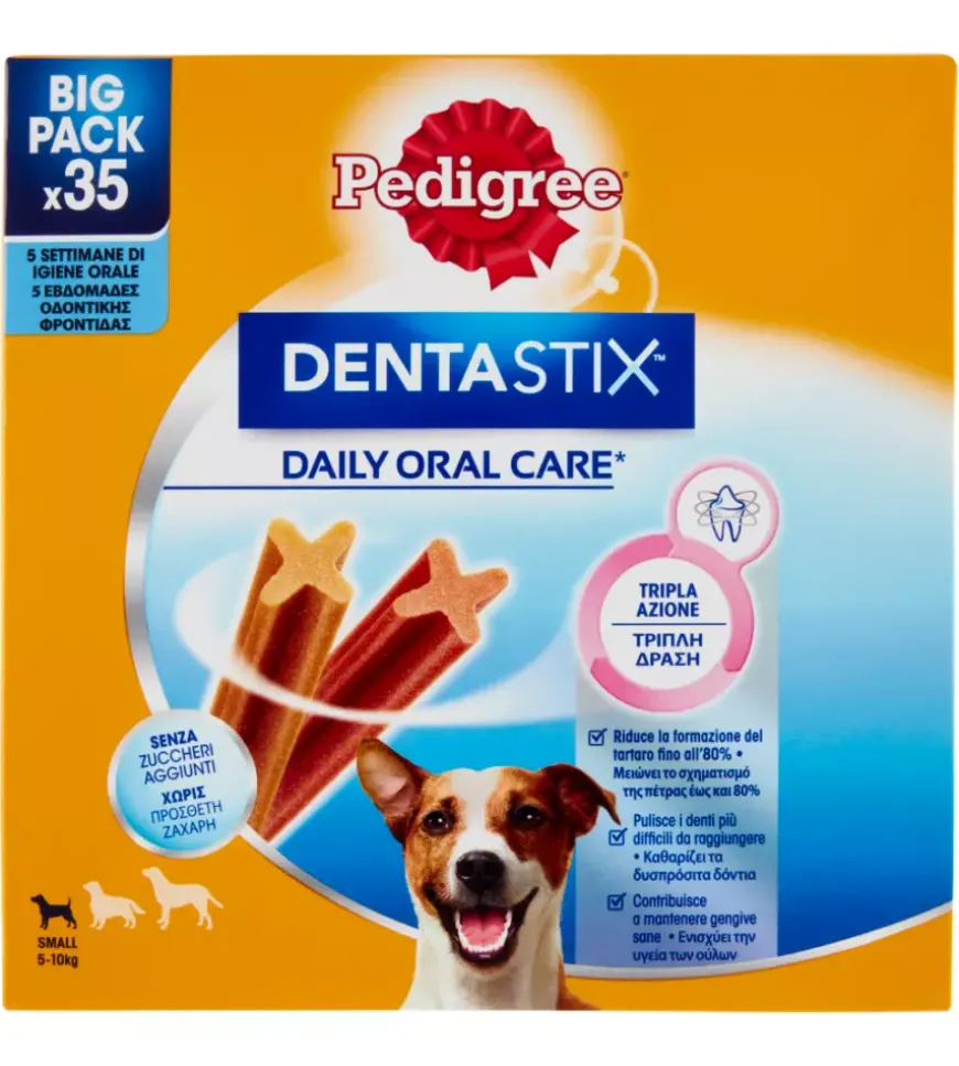 35 snack da masticare Pedigree “Dentastix” per l’igiene orale del tuo cane di taglia piccola. Dotato di una formula che aiuta a ridurre la placca e il tartaro.