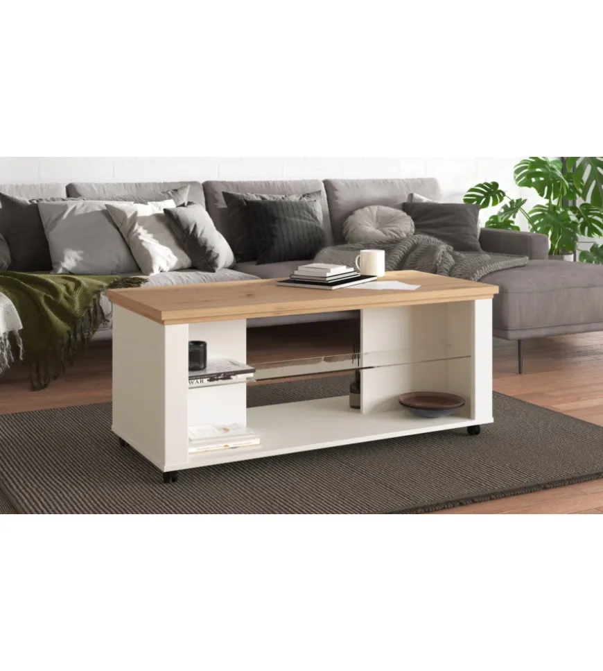 Tavolino da soggiorno “Vigo” bianco e quercia, con ripiano in vetro e ruote.