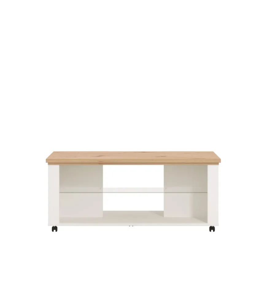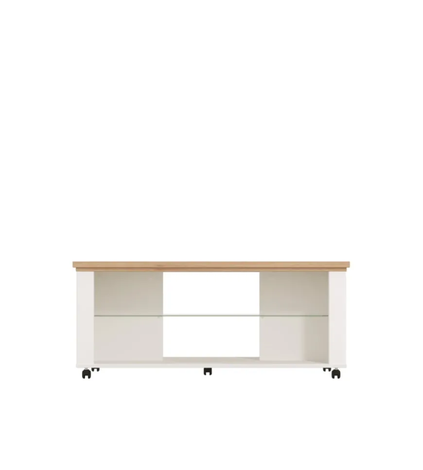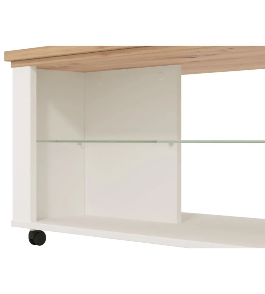 Tavolino elegante e multifunzionale, che unisce un design classico a dettagli moderni. La struttura bianca e quercia รจ completata da un ripiano in vetro, creando un piacevole contrasto visivo. Le ruote integrate consentono di spostarlo facilmente, rendendolo un complemento d’arredo versatile per il soggiorno.