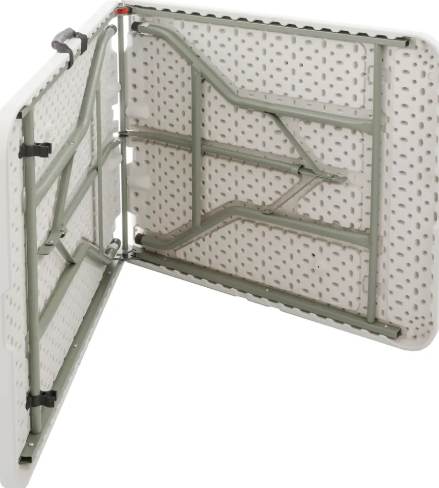 Tavolo pieghevole Club.Caratteristiche: Sistema bloccagambe di sicurezza Gambe regolabili in altezza Molto piatti quando ripiegati – facile da riporre Ripiano in plastica PE soffiato Gambe tavolo in acciaio verniciato a polvere, effetto martellato Lunga durata