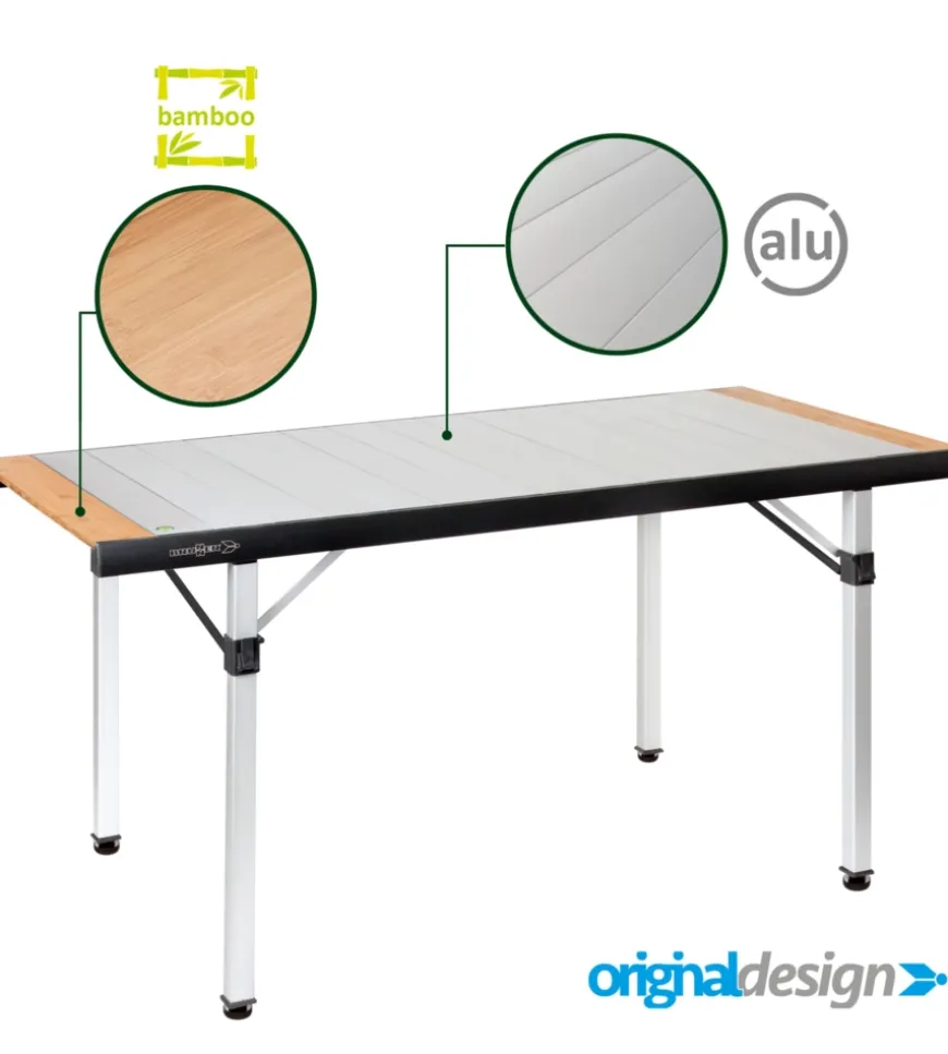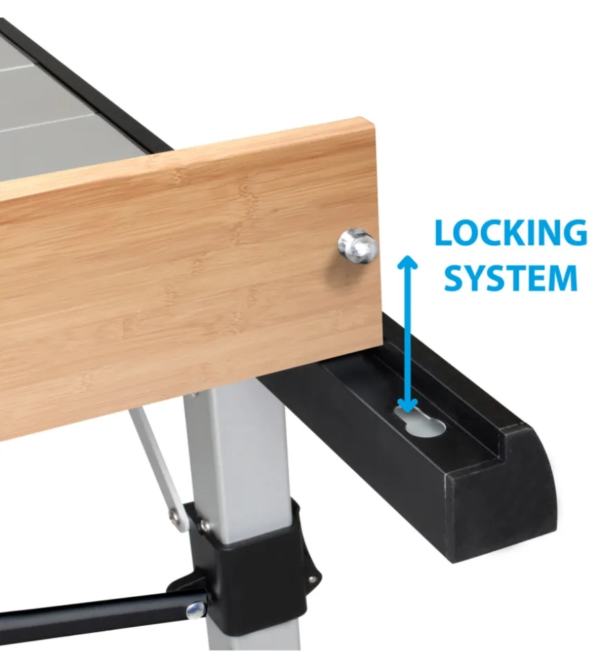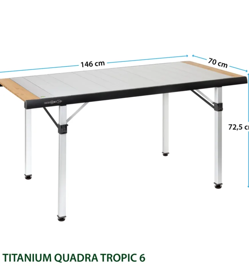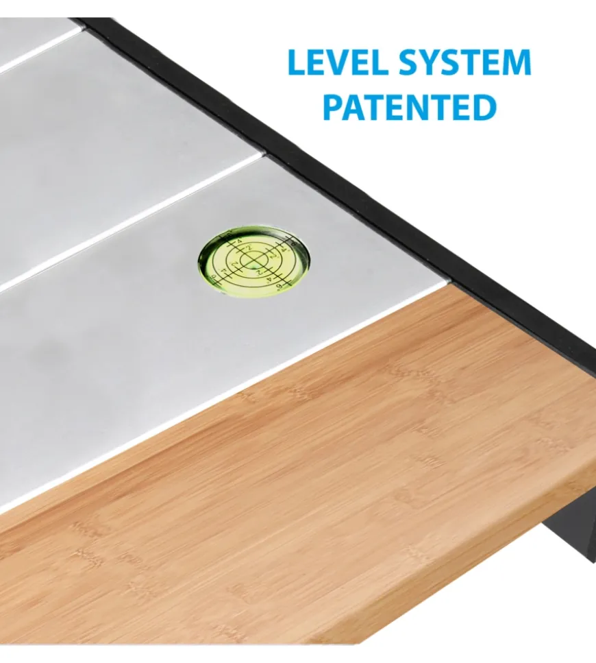 La versione elegante del Titanium Quadra NG. Ripiano in alluminio con listelli terminali in vero legno di bambù e livella a bolla d’aria integrata per il perfetto funzionamento del nuovo sistema di livellamento 90° Adjustar. Con borsa da trasporto.