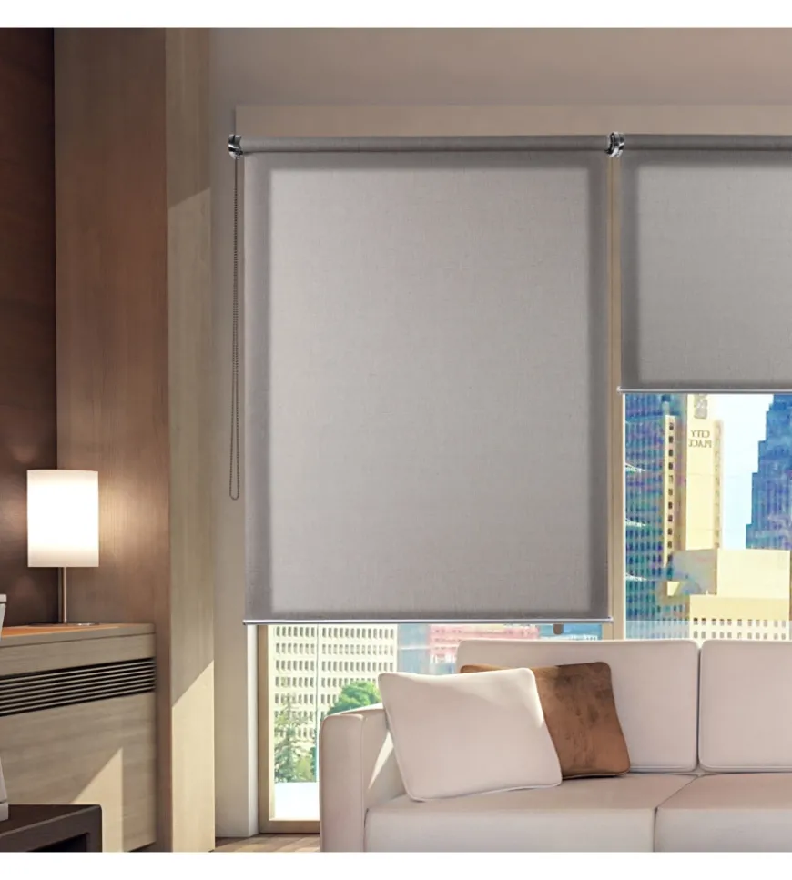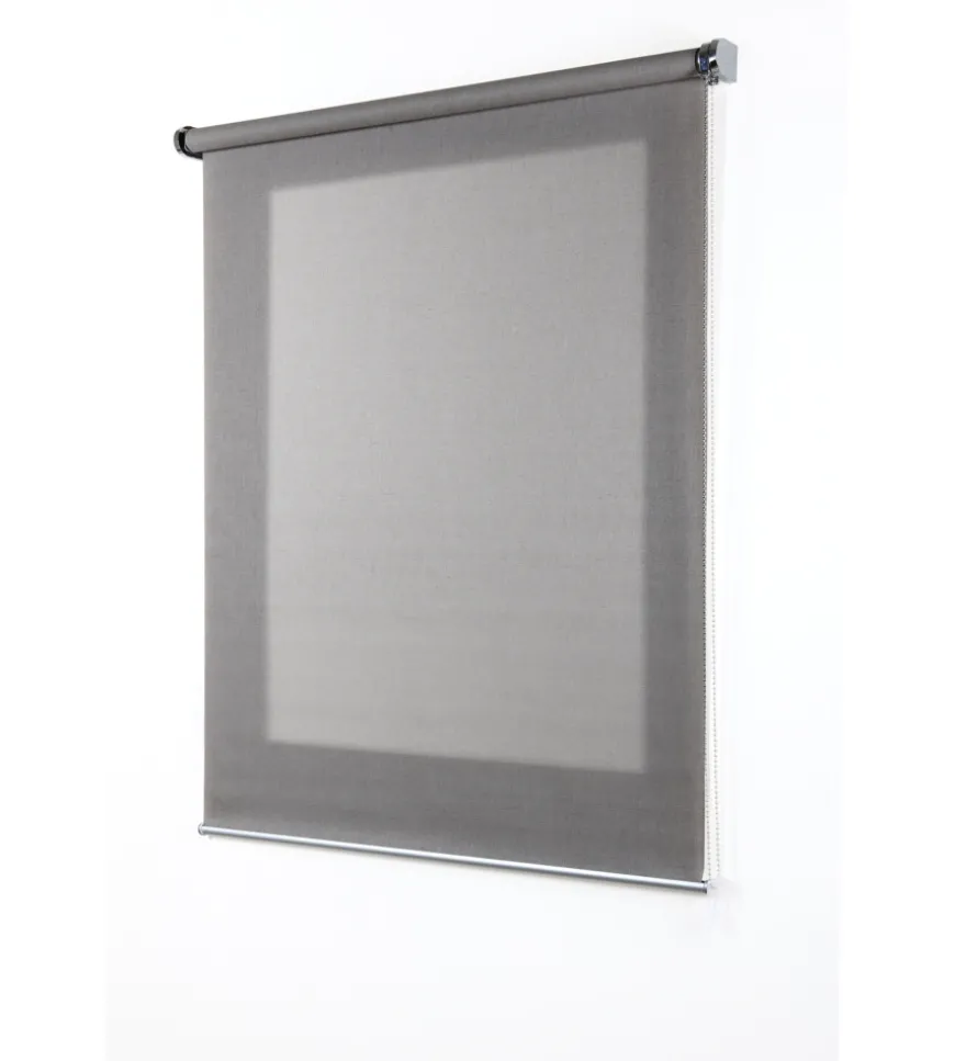 Tenda a rullo filtrante con materiale simile al lino, che richiama ambienti naturali e sofisticati. Installabile a soffitto o a parete, è provvista di contrappeso in alluminio a vista. Facile azionamento con catenella, premontata sul lato destro. Possibile spostamento sul lato sinistro. La tenda si può pulire con un panno leggermente umido. Comprese le staffe per l’installazione a parete o soffitto.