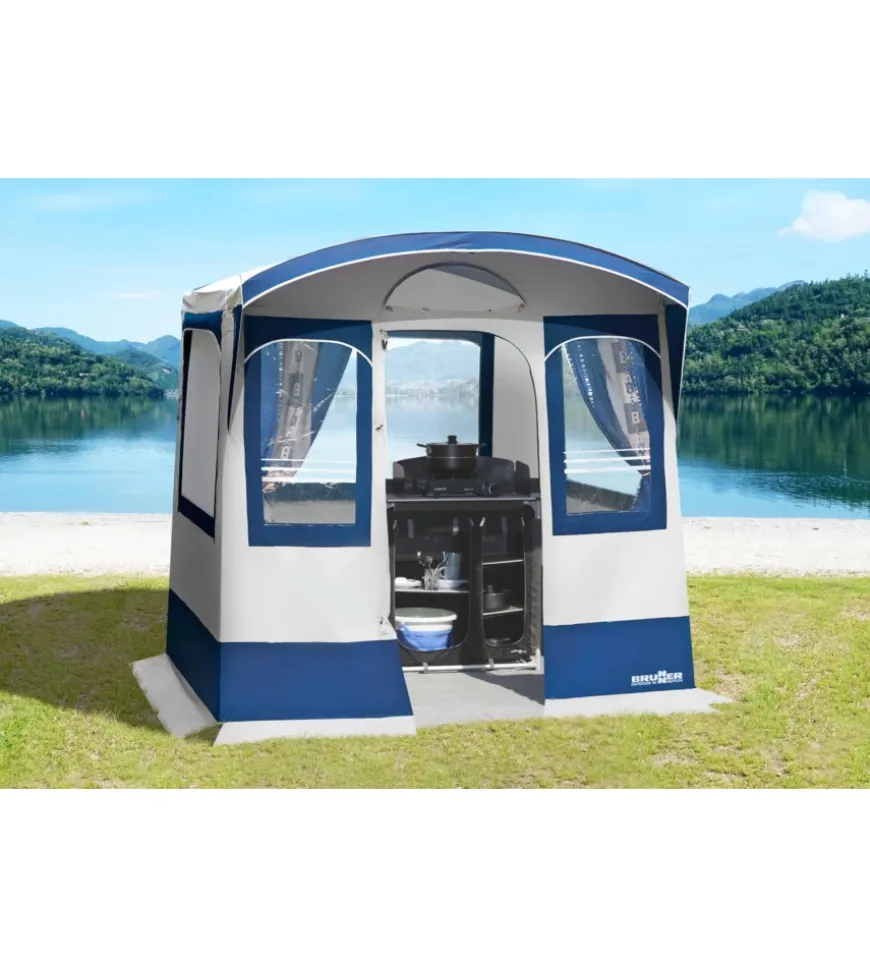 Tenda cucina da campeggio Brunner “Camp Inn” multiuso con tetto arcuato, 220x160x195/220 cm. La moderna tenda cucinotto multiuso con il suo design innovativo presenta un tetto arcuato in poliestere, resistente e impermeabile su entrambi i lati, che si adatta perfettamente alle verande caravan più recenti. Con ampio spazio interno e tre finestre dotate di zanzariere ed oscuranti, offre un’eccellente illuminazione e aerazione. Le eleganti tendine delle finestre anteriori in “Cristal” aggiungono un tocco di classe. La porta d’ingresso centrale è comoda e arrotolabile lateralmente per un accesso senza ostacoli. La struttura in acciaio zincato assicura resistenza e durabilità. Disponibile in una misura unica, è il compagno perfetto per le tue avventure all’aria aperta.