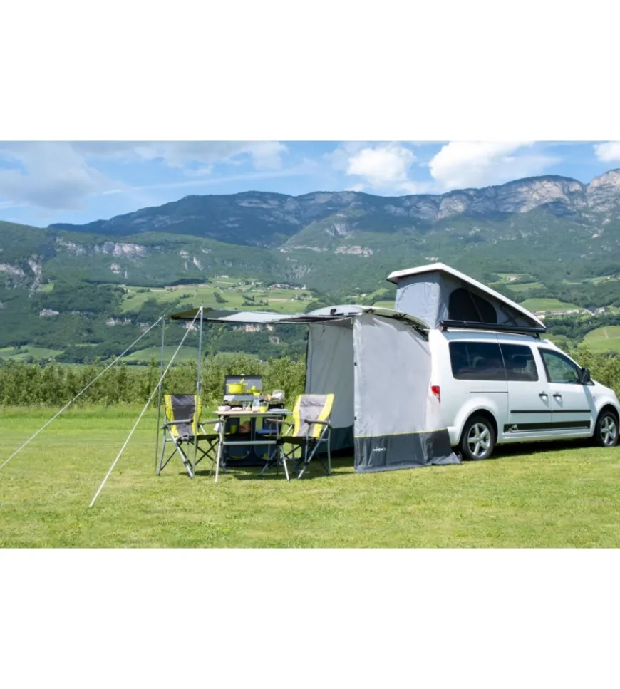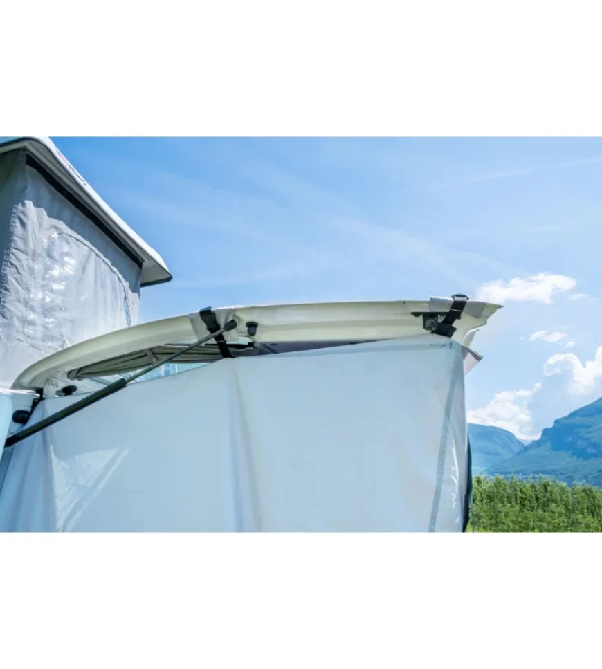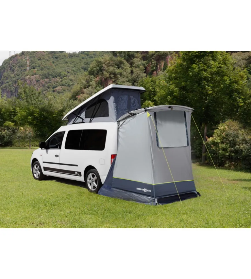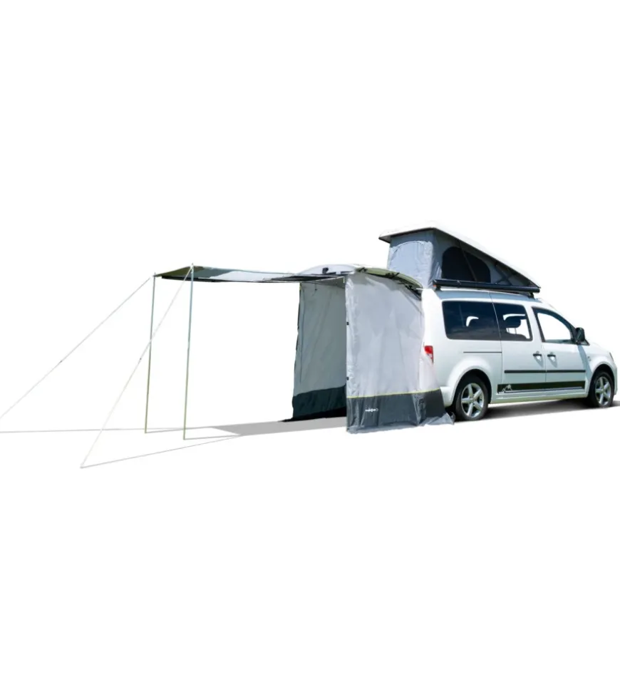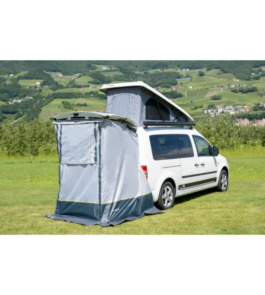 Tenda posteriore senza telaio appositamente sviluppata per essere fissata al portellone posteriore del VW Caddy. Ideale per creare ulteriore spazio nella parte posteriore del veicolo e per ottenere una maggiore libertà di movimento al suo interno. Montaggio semplice e veloce. 1 grande porta d’ingresso garantisce una buona ventilazione e un clima interno piacevole. Con materiale di fissaggio e borsa per il trasporto.