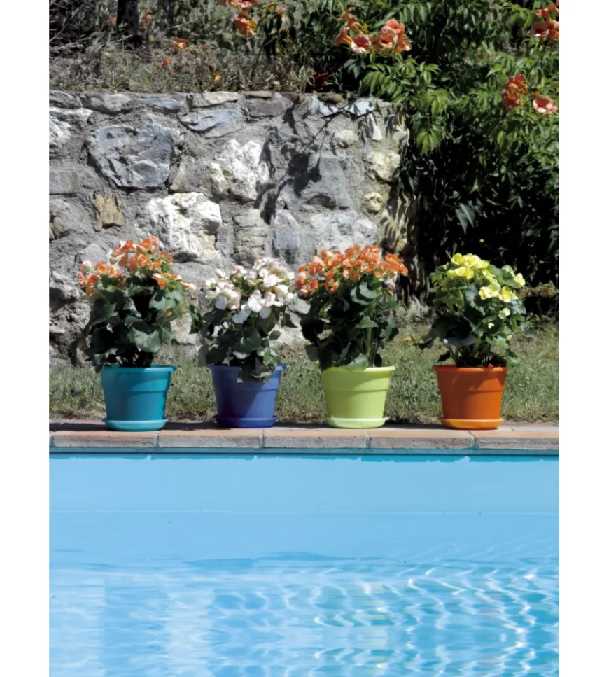 Simpatico portavaso provvisto di sottovaso in finitura trasparente e disponibile in vivacissimi colori assortiti. Resistente agli sbalzi di temperatura, agli urti e ai raggi solari.