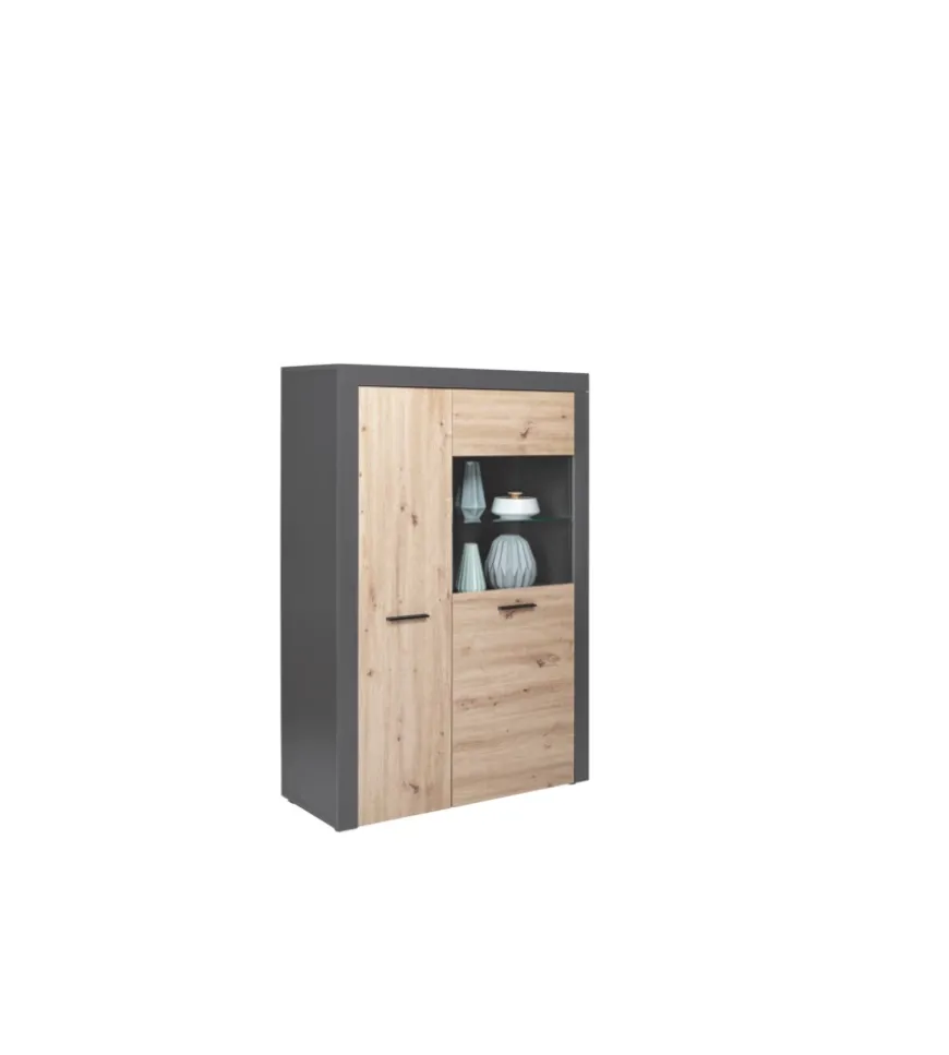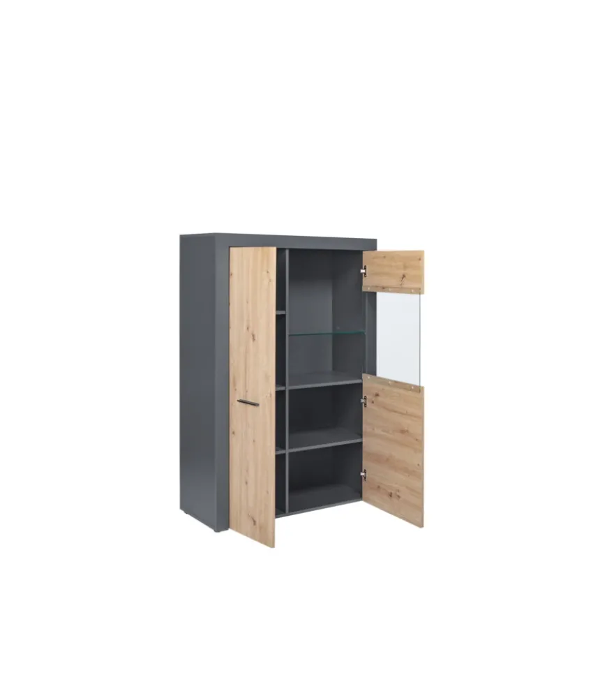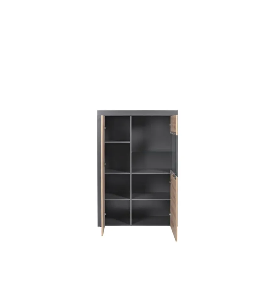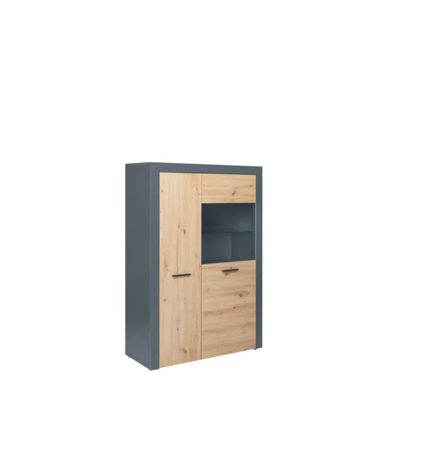 Vetrina moderna, in stile industriale, con struttura grigia ed ante rifinite effetto quercia.