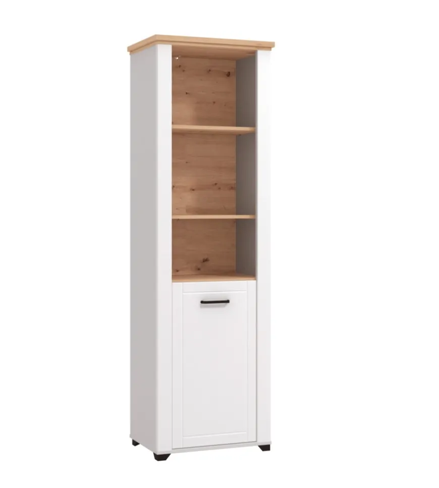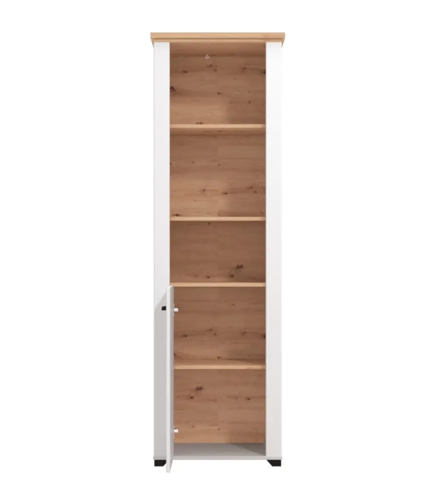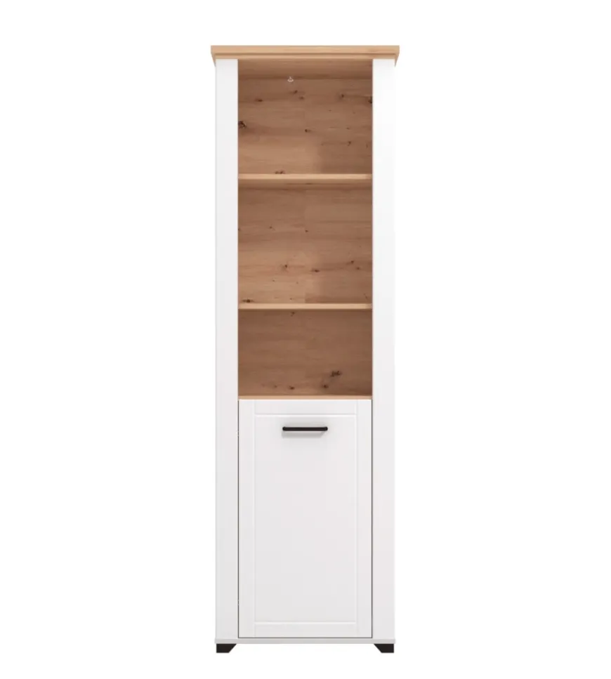 Elegante vetrina con finitura bianca e dettagli in effetto quercia, perfetta per un soggiorno dal design moderno e raffinato. Dotata di due ripiani a vista e un’anta con maniglia in metallo nero, questa vetrina unisce funzionalità e stile in un unico mobile.