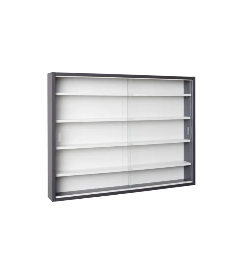 Vetrinetta scaffale con ante in vetro scorrevole e struttura in legno tinto grigio.