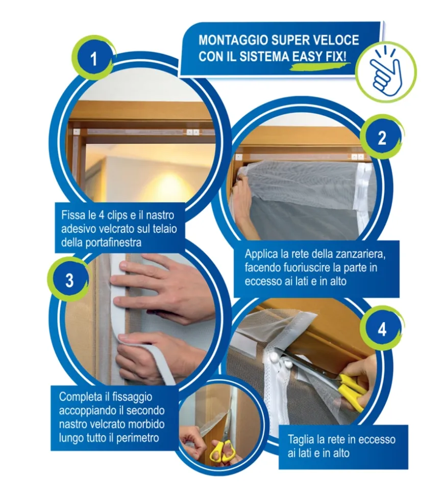 - Kit con telo in poliestere, nastro adesivo, 4 clip e maniglia di fissaggio